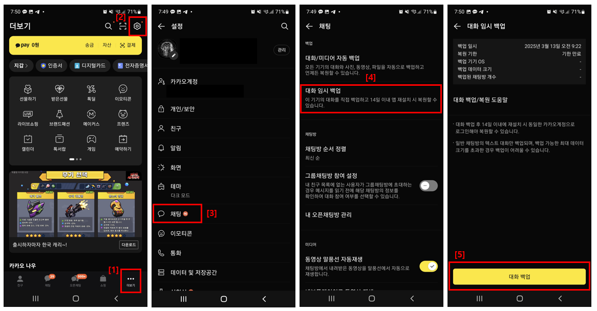 - [4]번 위치에 있는 [대화 임시 백업]을 눌러주세요.