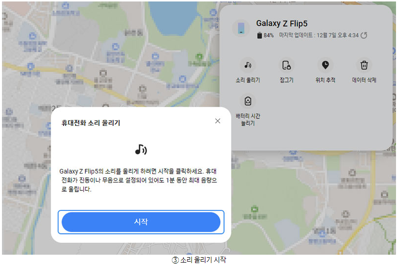 • 내 디바이스에서 삼성 계정을 등록하고 [이 휴대전화를 찾을 수 있도록 허용] 옵션을 켰다면, SmartThins Find 웹사이트 접속 (https://smartthingsfind.samsung.com)에 로그인해서 위치를 확인할 수 있습니다.