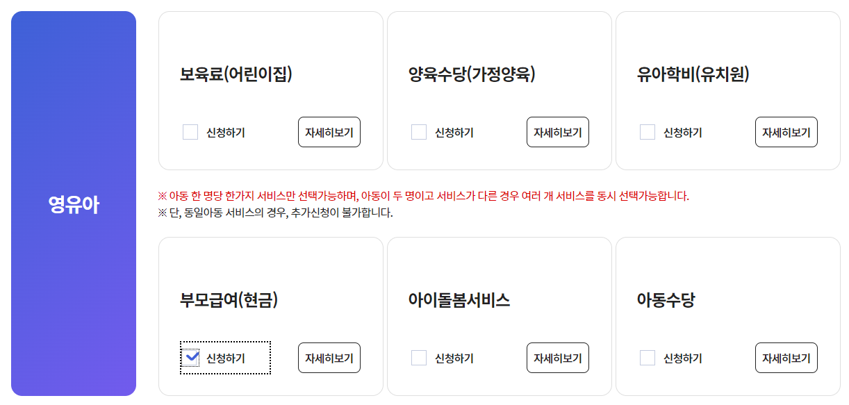 부모급여와 종일제 아이 돌봄 서비스는 중복 지원 안됩니다.