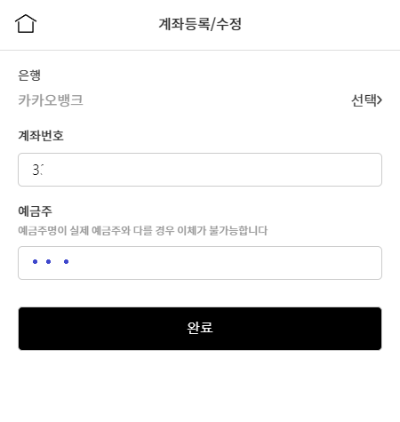 편하게 사용하는 계좌를 등록하면 되는데 저는 카카오뱅크의 계좌를 등록했습니다.