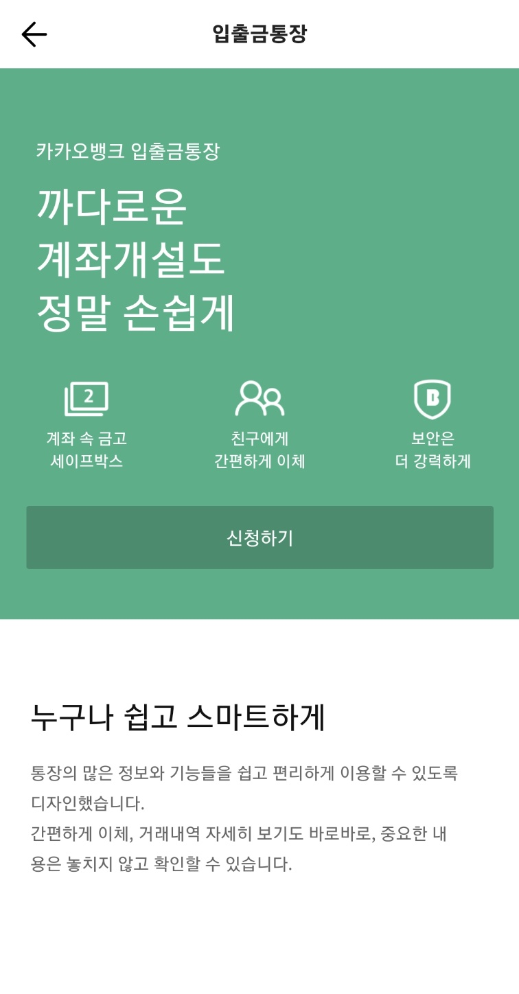 - 카카오뱅크 입출금통장을 클릭하고 신청하기를 눌러요.