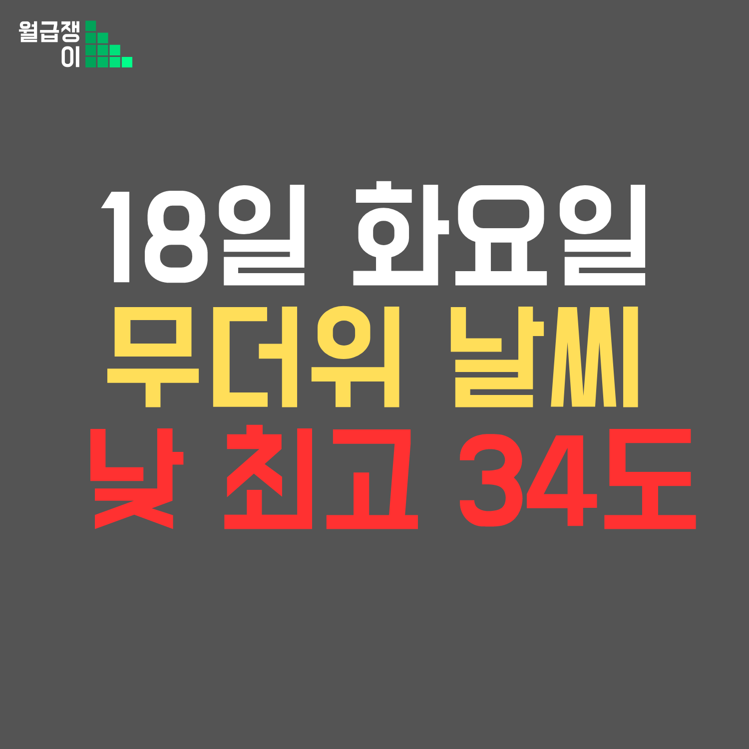 오늘 18일 화요일, 경기도 전역에는 무더위가 계속될 전망입니다. 수도권기상청에 따르면, 도내 아침 최저기온은 15 ~ 20도, 낮 최고기온은 28 ~ 34도로 예상됩니다.